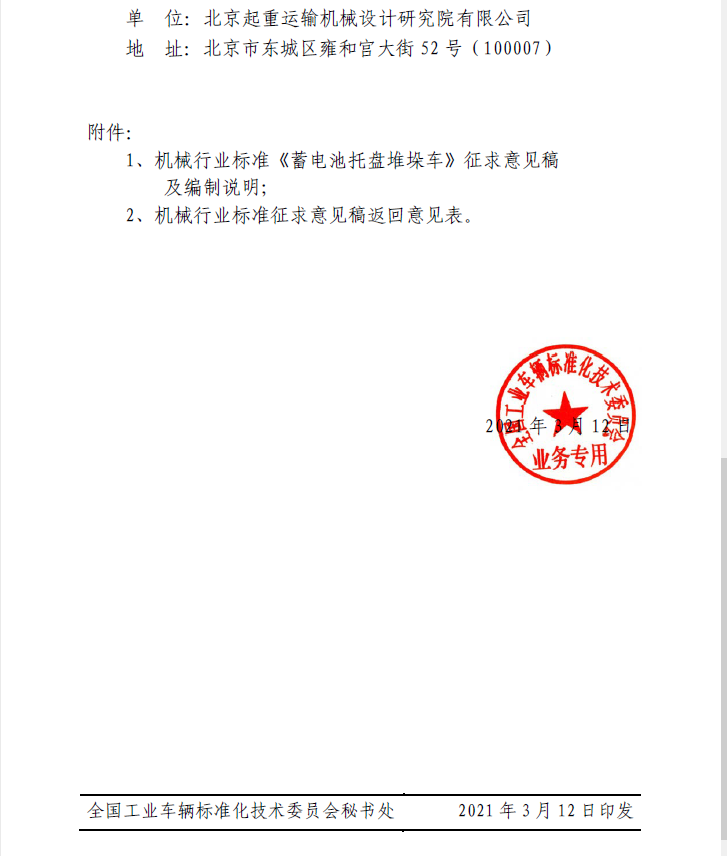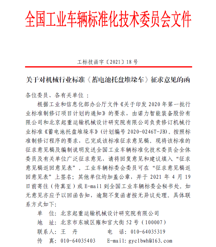 根据工业和信息化部办公厅文件《关于印发2020年第一批行业标准制修订项目计划的通知》的要求,由诺力智能装备股份有限公司和北京起重运输机械设计研究院有限公司负责修订机械行业标准《蓄电池托盘堆垛车》(计划编号2020-0246T-JB)。按照标准制修订程序的要求,已完成该标准征求意见稿。现将该标准的征求意见稿及编制说明发送全国工业车辆标准化技术委员会全体委员及有关单位广泛征求意见,请将回复意见和建议填入“征求意见稿返回意见表”。工业车辆标委会委员可在“征求意见稿返回意见表”上签名;其他单位均加盖公章,并于2021年4月19日前寄往(传真至)或E-mail到全国工业车辆标委会秘书处。如无意见亦应予以回函告知,逾期不复函者按无异议处理。具体联系方式如下:
