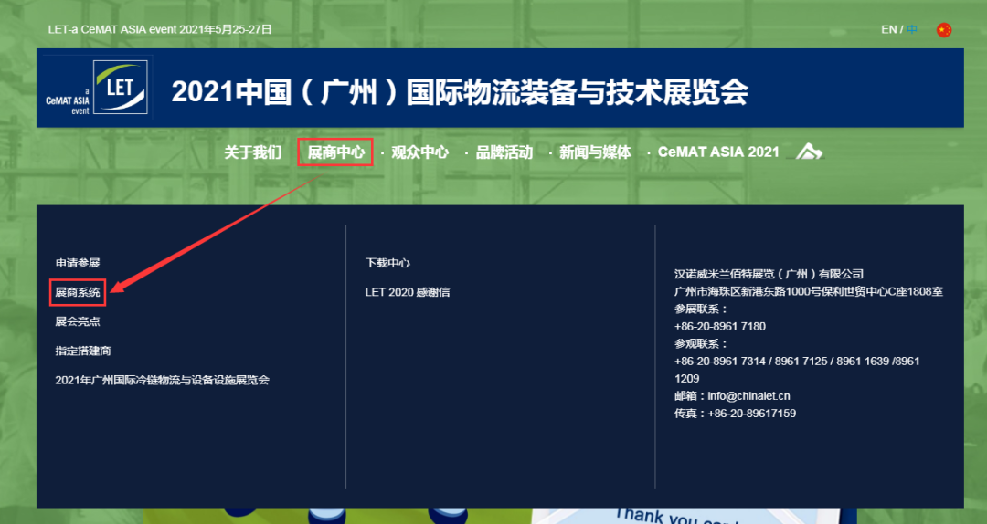 进入汉诺威LET中国广州物流展官网www.chinalet.cn,点击 展商中心栏目下方的 展商系统,根据提示点击进入展商系统,登录账户。
