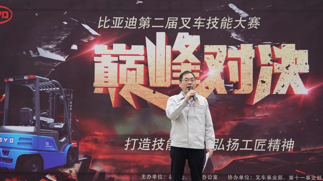 赵总为开幕式致辞。他对参加决赛的全体参赛选手表示了热烈祝贺,并指出:公司深耕实业25载,在电子、汽车、新能源、和轨道交通等领域取得瞩目成就,靠的是秉承匠人之心的员工。本次叉车技能大赛,旨在弘扬工匠精神,打造比亚迪技能精英,助力公司高质量发展。
