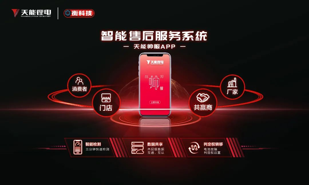 在服务体系上,天能锂电拥有一套完整的“线上+线下”智能售后服务体系,依托云端技术,天能帅服app是前端数据的呈现,后台大数据是核心技术支撑。智能后台服务器会综合计算前端数据,不断进行算法更新,提升前端检测精准度,进而提升用户体验。线上以天能帅服APP为智能化实现手段,通过现代互联网技术实现消费者、门店、共赢商、厂家四大端口电池数据共享,将故障判定权进行前端转移;线下拥有完善售后渠道网络,增加售后当地化能力。