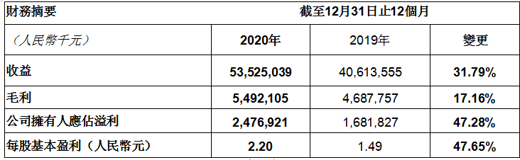 2020年,集团坚持“稳中精进”的工作总基调,面对新冠疫情考验,加强疫情防控,推进生产经营,在全体员工有条不紊的扎实工作中圆满达成了全年各项目标,取得了良好的效益。子公司天能电池集团股份有限公司(「天能股份」)〔证券代码:688819.SH〕于上海证券交易所科创板分拆上市成功,也标志着集团的高质量发展迈入全新阶段。报告期内,集团实现营业额约人民币535.25亿元,较上年同期增长31.79%,股东应占溢利约人民币24.77亿元,较上年同期增长47.28%。