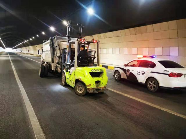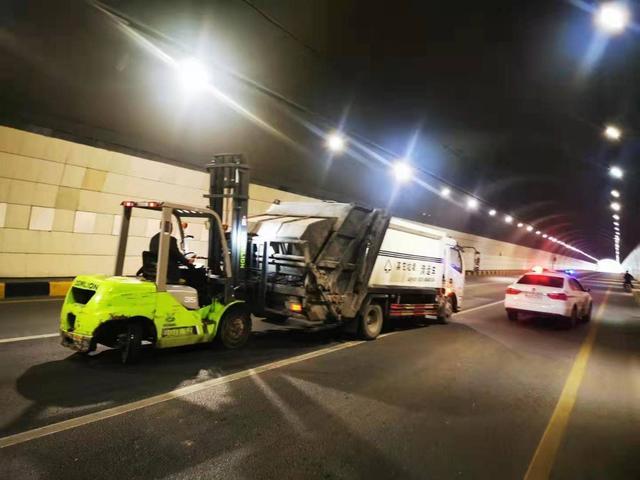 7点40分许,由办事处协调的叉车来到现场。民警指挥叉车托起清运车车厢左后方,代替左后轮承重前行作用,清运车启动以后果然能够缓慢行驶,在2辆警车的前后护送下,在8点钟左后清运车移动至隧道外加宽带,暂不影响车辆通行。8点20分许,受清运车故障积压的车流全部恢复!