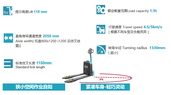 1330mm的超小转弯半径,即使狭窄的仓库作业通道也能应对自如。