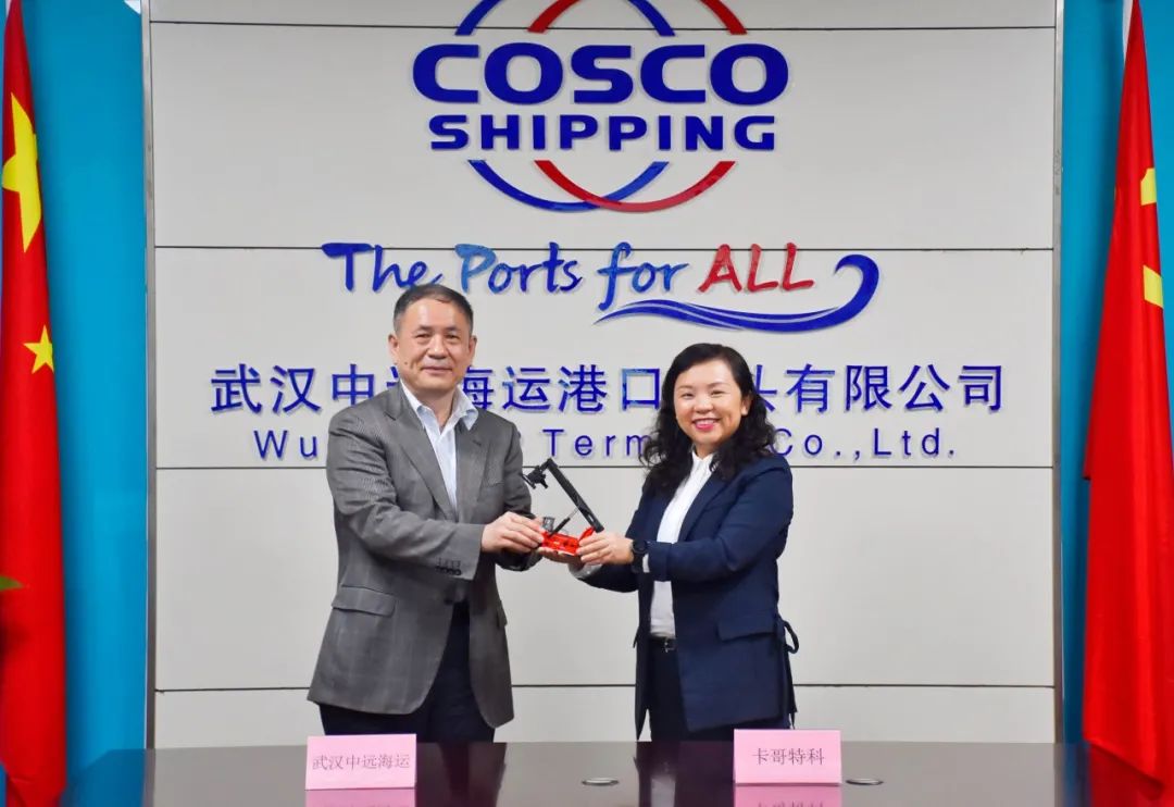 双方在武汉中远海运港口码头有限公司会议室举行了签约仪式,武汉中远海运港口码头有限公司总经理邱金城,卡尔玛全球副总裁,大中华区负责人张姝姝代表双方签署合同。