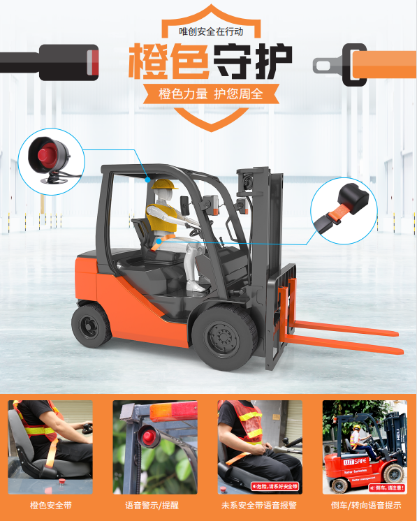这是一款由唯创安全自主研发的用于叉车的安全带报警器。由安全带和报警器组成,免去另行购买安全带的烦恼。安全带是橙色的,辨识度高。