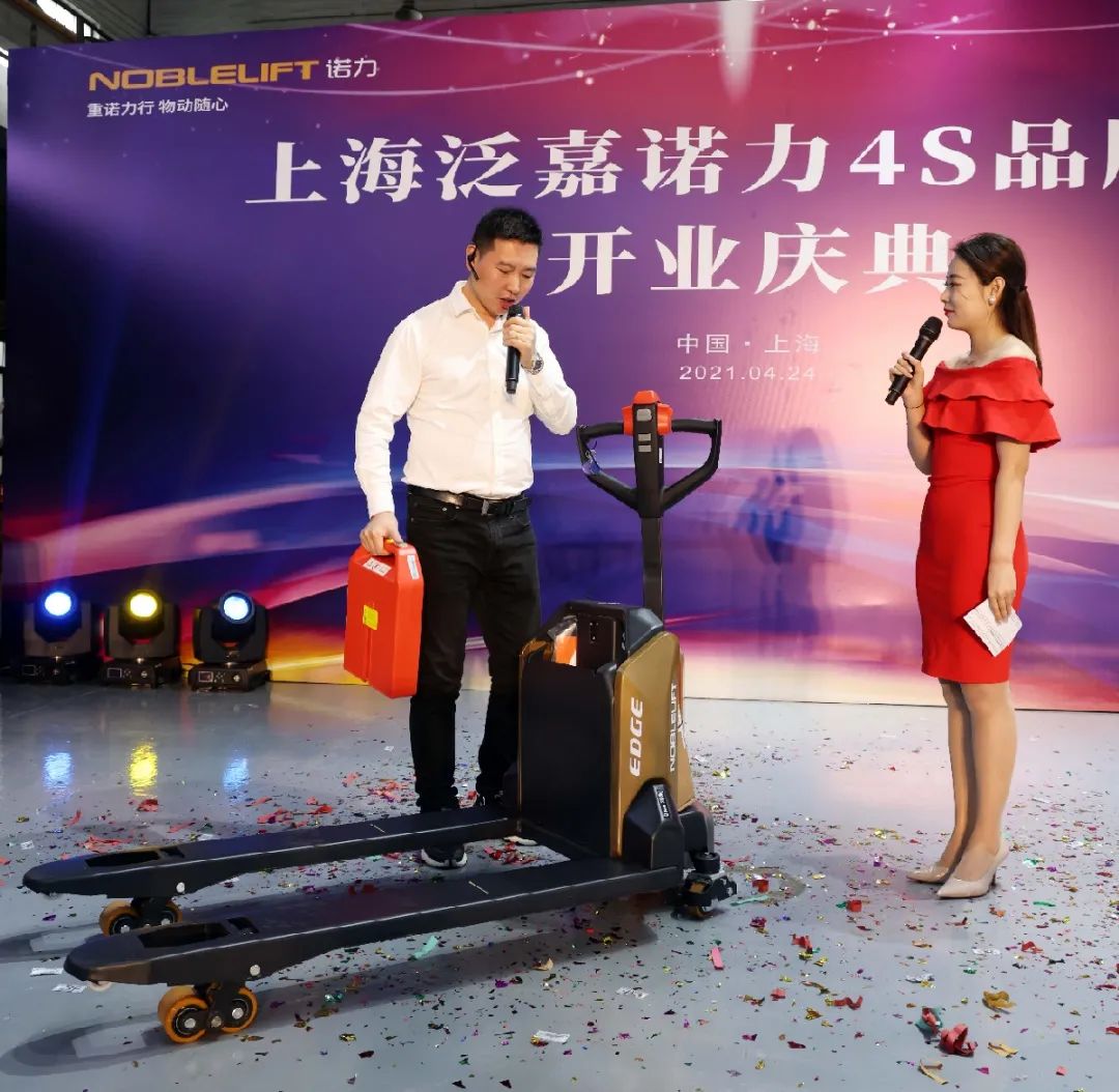 开业典礼上,诺力电动搬运车PTE20N,PT20N,电动堆高车PSE15-C,电动叉车FE4P20Q,以及大前移RT20B通过直播的方式,集体亮相开业典礼。诺力股份大客户经理张伟兵,向参加开业庆典的嘉宾作详细介绍。