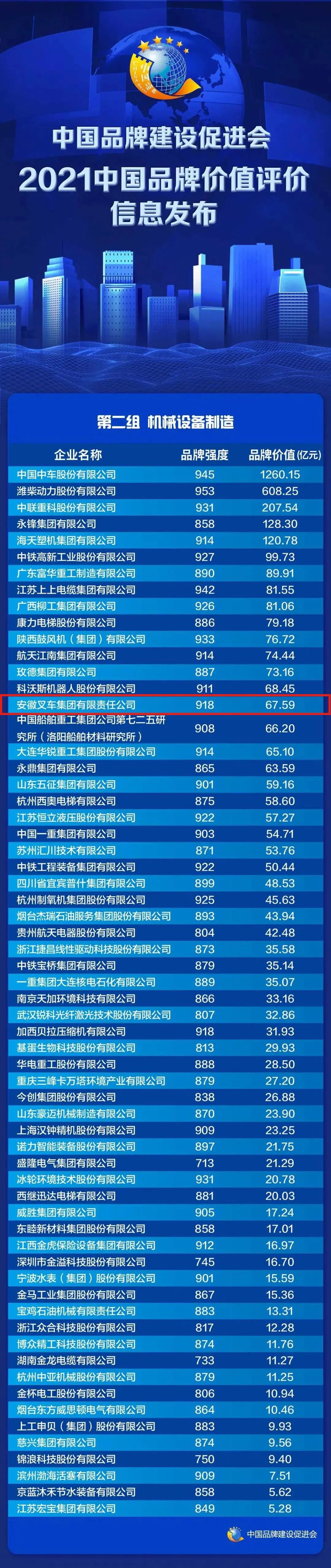 5月9日,由新华社、中国品牌建设促进会等单位联合举办“2021中国品牌价值评价信息发布暨中国品牌建设高峰论坛”在上海国际会议中心同期举行。安徽叉车集团以918的品牌强度和67.59亿元的品牌价值位列机械设备制造排行榜第15名。