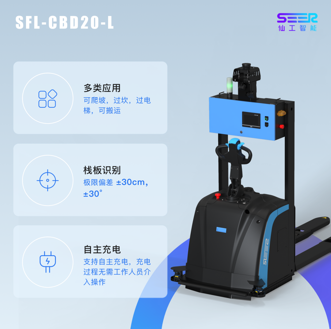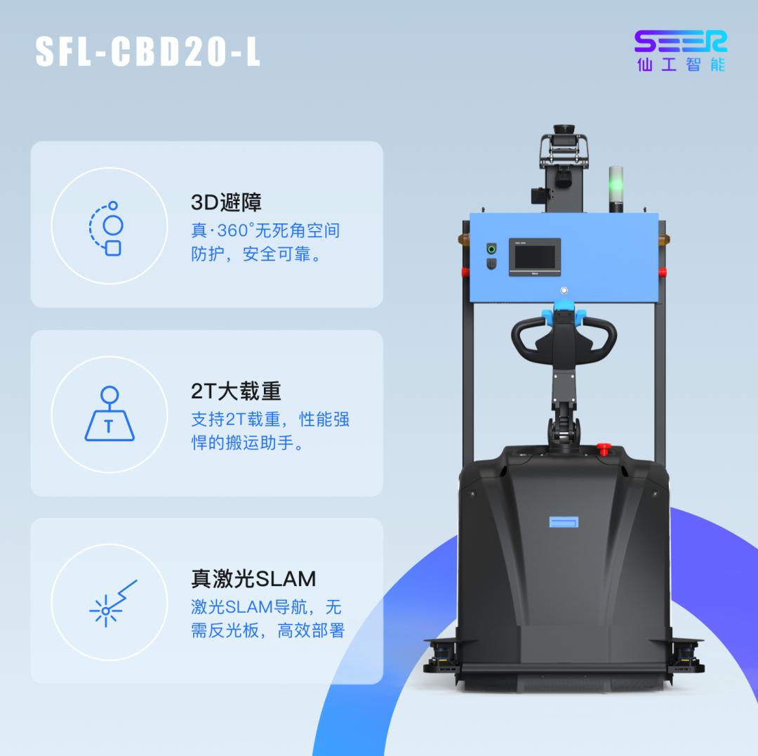 除了上述的更新点外,SFL-CBD20-L沿用SFL-CBD20-S的其他配置,内置仙工智能(SEER)SRC核心控制器,可提供地图构建、定位、导航等基础功能和多机调度、自动充电、3D 避障等功能,让定位更精准,使运行更安全。