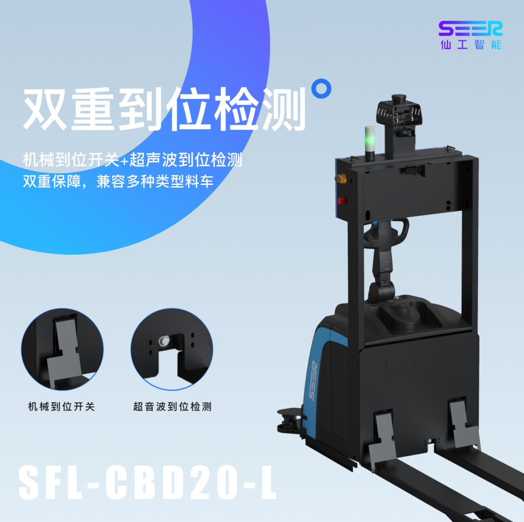 SFL-CBD20-L采用械到位开关+超声波到位检测的双重到位检测,轻松解决纺织行业物料车装载不规则的搬运难题!同时还能兼容更多类型的料车,一次性满足大载具搬运需求。