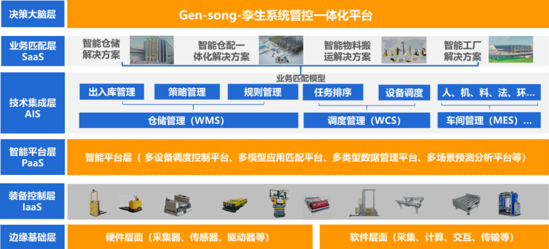井松智能孪生系统管控一体化平台是智能物流、智能制造系统集成的决策大脑,通过纵向的边缘层、控制层、平台层、集成层、业务层等与横向的硬件设备、业务需求、任务功能等进行双坐标匹配融合一体化应用,实现智能集成、智能管控、智能可视、智能精益。