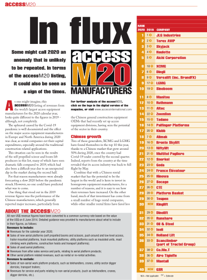 《国际高空作业机械》显示,2020年受全球新冠疫情影响,欧美等主要高空作业机械制造商销量受影响明显,而得益于中国政府对新冠疫情有效而强力的控制,中国经济快速的恢复,中国高空作业机械制造商异军突起,成绩亮眼。