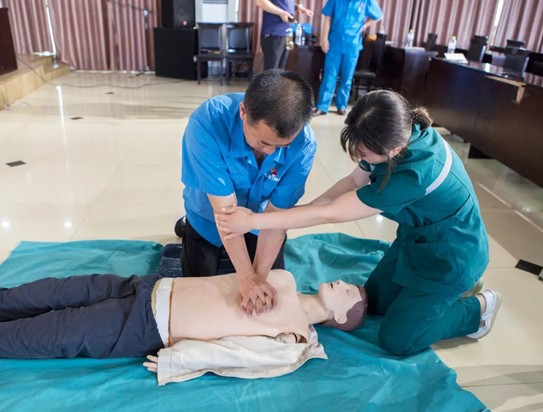 职业病防治院有关专家对企业如何开展职业卫生管理工作进行宣讲,现场开展了心肺复苏急救实操培训,并进行一对一指导,现场气氛活跃,员工积极参与,取得了良好效果。