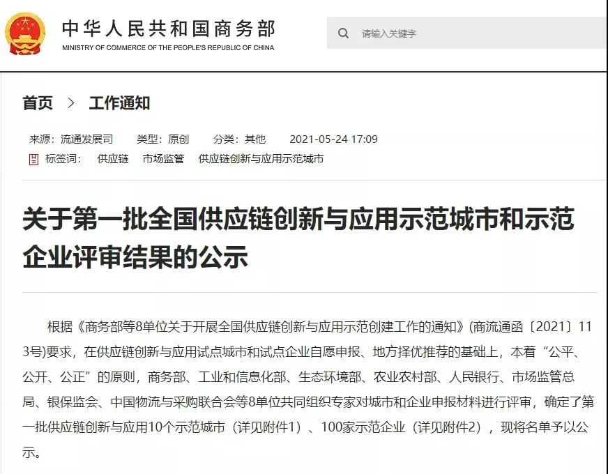 据悉,2019年,安徽合力与省商务厅联系,积极开展申报工作,当年共有安徽合力等5家安徽企业被评为“全国供应链创新与应用试点企业” 。经过两年的试点考核期,今年由商务部、工信部、生态环境部、农业农村部、人民银行、市场监管总局、银保监会、中国物流与采购联合会等8单位共同组织专家对城市和企业考核、申报材料进行评审,公示了第一批供应链创新与应用10个示范城市和100家示范企业,安徽合力成功入选第一批全国供应链创新与应用示范企业公示名单。