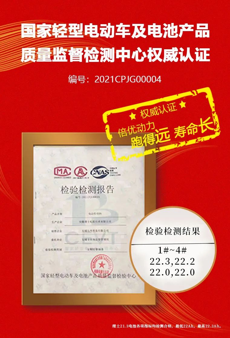 近日,无锡市市场监督管理局对理士电池定期监督抽查,经由国家轻型电动车及电池产品质量监督检验中心抽检的检测报告正式下发。在报告结果中,理士黑霸王21.3电池各项指标均检验合格并远超预期,检测得到最高实际容量22.3Ah,最低实际容量22Ah,实际容量约超标称容量的5%,超出国家标准的11.5%。容量更高,电池一致性更好,续航更持久 ,这份报告也从侧面证实了理士黑霸王系列电池的真材实料!不虚标!