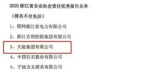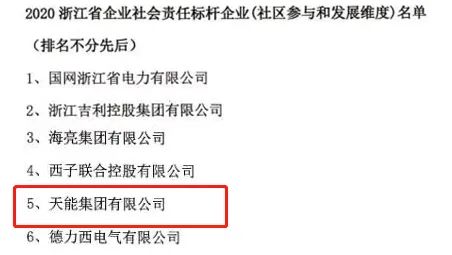 5月6日,2020浙江省企业社会责任优秀报告和标杆企业名单正式公布,天能入选“2020浙江省企业社会责任优秀报告”和“2020浙江省企业社会责任标杆企业(社区参与和发展维度)”名单。一同入选的还有国网浙江省电力、吉利控股集团等单位。
