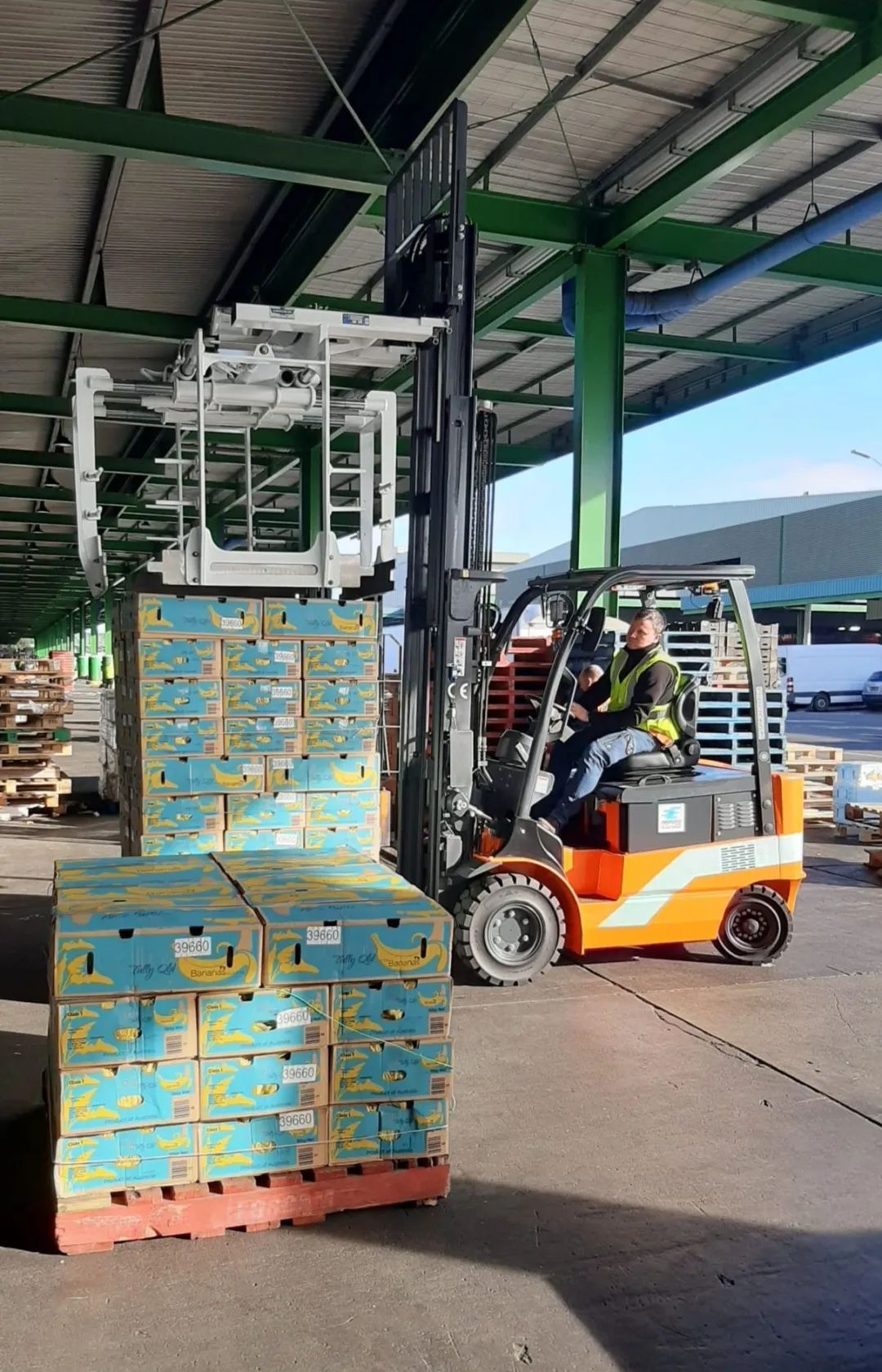 宝骊2.5T电动平衡重叉车正在澳大利亚一物流集散中心内搬运货物,装有砖块夹的宝骊叉车能够在不增加劳动力的情况下更高效地完成搬运作业。
