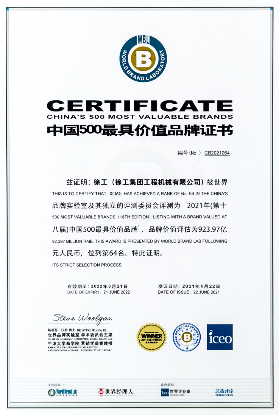 数据显示,2004年前500名品牌的平均价值为49.43亿元。18年以后的2021年,前500名品牌的平均价值高达557.91亿元,增加幅度为1028.69%。而徐工,品牌价值较上年提升121.21亿元,同比增长15.10%,高居中国工程机械行业第一。