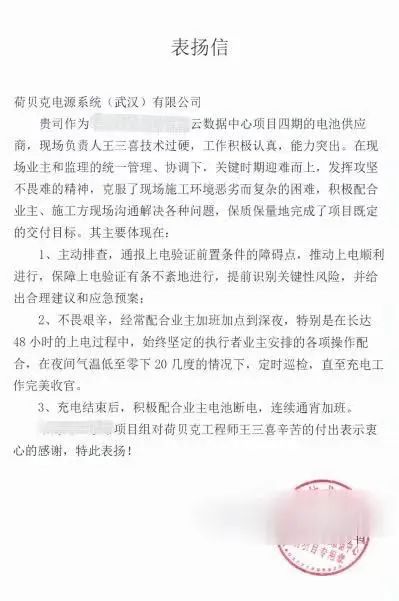 近日,我们收到H客户云数据中心四期项目部发来的表扬信,对公司服务部的工程师王三喜,给予通报表扬,充分表明客户对服务工程师在现场工作的肯定和认可。