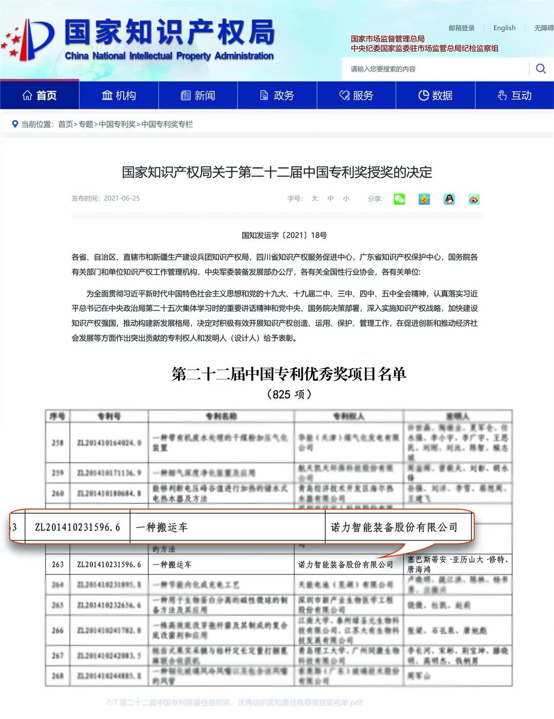 近日,第二十二届中国专利奖、2020年度浙江省科学技术奖获奖名单接连正式揭晓,诺力股份"一种搬运车”、“无人驾驶工业车辆关键技术及产业化应用”两项项目喜获中国专利优秀奖以及浙江省科学技术进步二等奖。