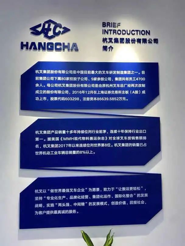 杭叉集团是中国目前最大的叉车研发制造集团之一。目前集团公司下属70多家控股子公司、7家参股公司,集团共有员工4100余人。母公司杭叉集团股份有限公司是由原杭州叉车总厂经两次改制成立的股份有限公司,2016年12月在上海证券交易所主板(A股)成功上市,股票代码603298,注册资本61885.418万元。
