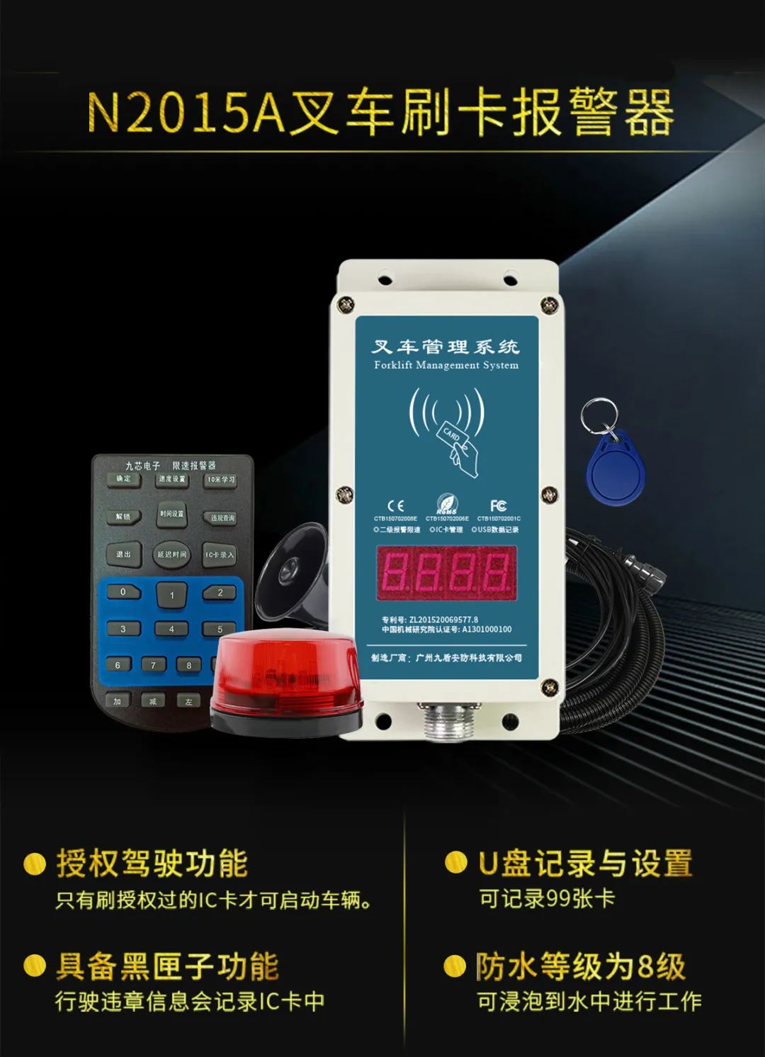 而九盾安防N2015A叉车刷卡限速器可以有效地限速叉车,授权驾驶功能,只有刷卡授权过的IC卡才能启动车辆,装上它可以有效地预防叉车事故发生。