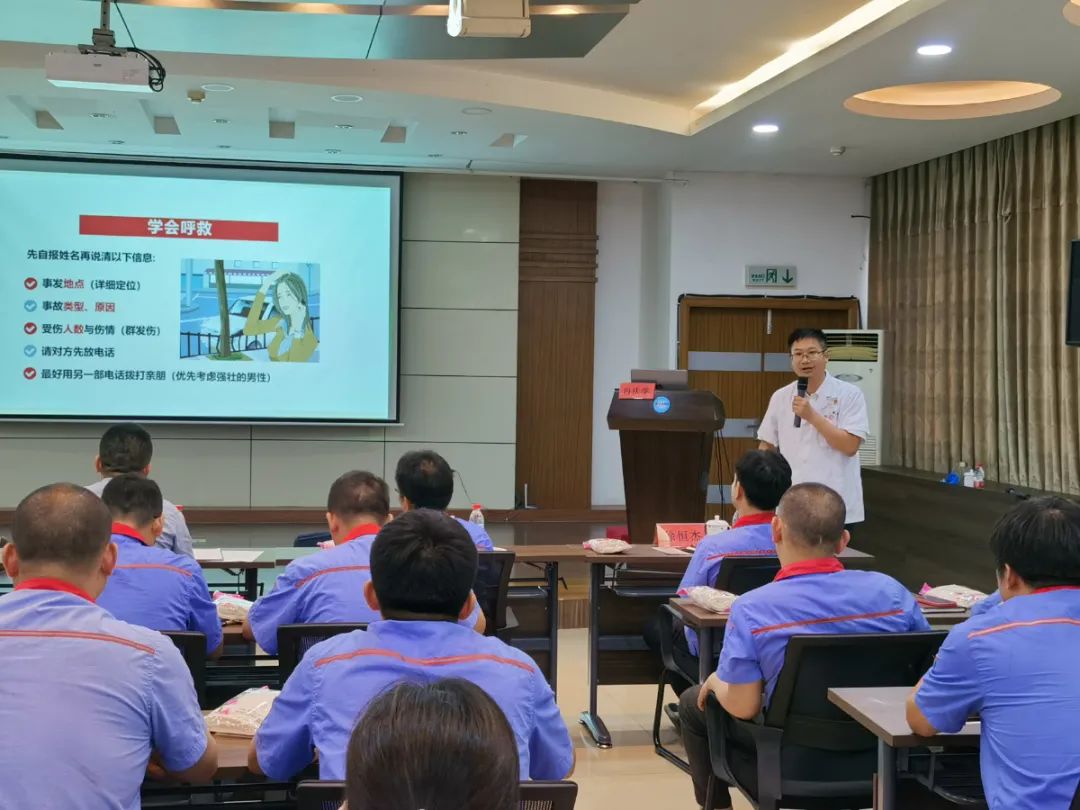❂【煤山公司】为预防高温中暑,保障安全生产有序进行,7月15日,煤山公司开展夏季急救知识专题培训,特邀浙江省医疗健康集团长兴医院副主任医师冉庆学为员工讲解应急救护、心肺复苏、防暑降温及急救措施等知识。