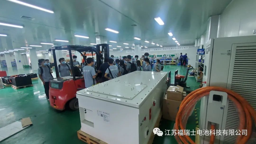 参观电源生产车间,技术负责人通过实物向师生们详细讲解各种电源产品生产流程的全过程以及产品的云平台数据管理系统,通过产品运行数据了解福瑞士最早的电动叉车电源产品已经5年,使用时间超过1.5万小时,师生们都惊叹锂电池技术的应用发展速度。