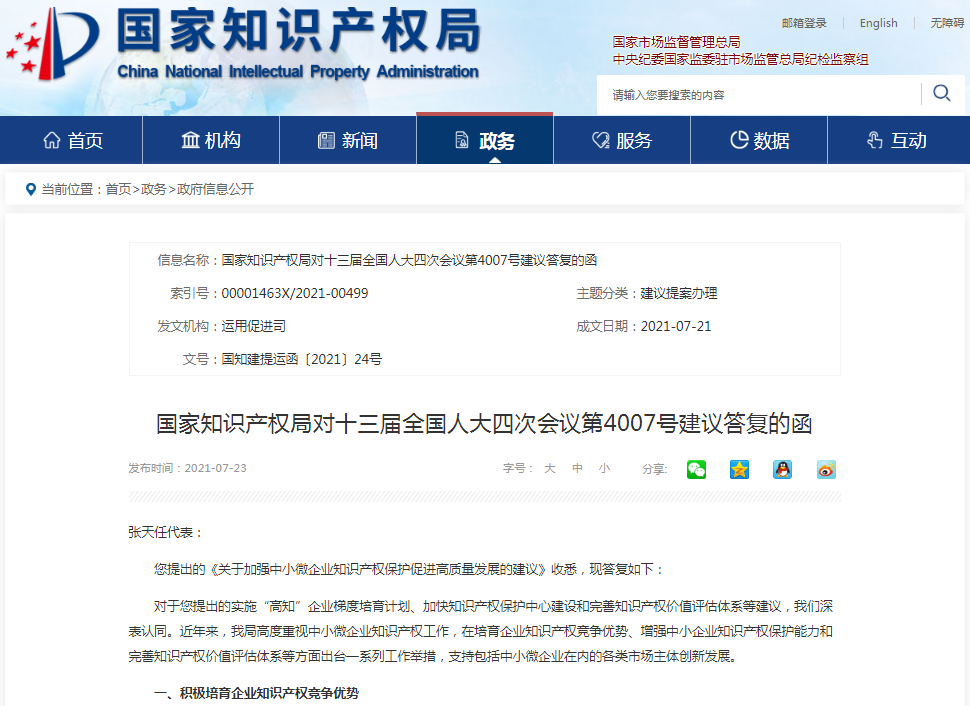 近日,国家知识产权局对这件十三届全国人大四次会议第4007号建议予以公开回复。回复中称,基于企业创新发展需求,积极培育企业知识产权竞争优势;积极推进快速协同保护机制建设,着力提升中小企业知识产权保护能力;推动完善知识产权价值评估体系。