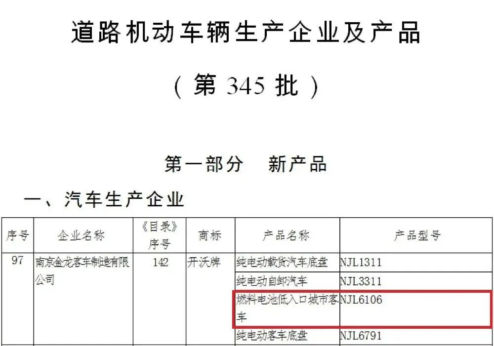 近日,工信部公布了第345批《道路机动车辆生产企业及产品》名单,装载着天能T60-C氢燃料电池系统的南京金龙NJL6106产品型号的燃料电池低入口城市客车上榜。