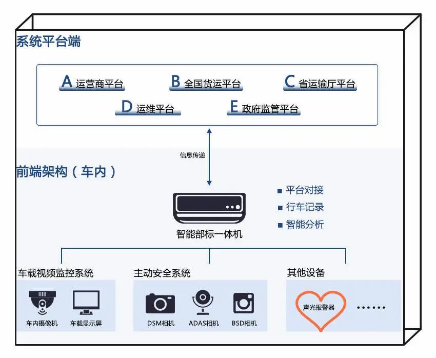 智能视频监控报警装置就是通过在车辆上安装车载视频监控、主动安全系统和声光报警器等设备,采集该车辆各项实时数据,经由智能部标一体机,利用移动通信技术和北斗定位技术等,将数据和定位传送给系统平台进行智能分析和决策监管。