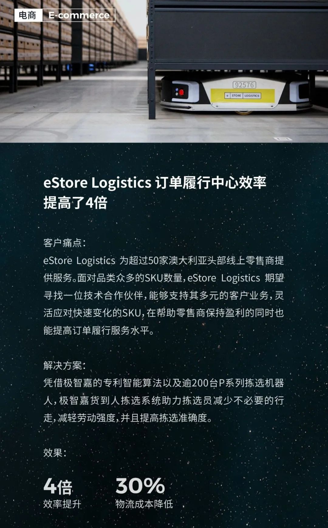 目前,极智嘉拥有遍及30多个国家和地区的全球化销售、运营和服务能力,与零售、鞋服、医药、3PL、汽车、新能源、电子行业深度融合。凭借卓越的产品技术和商业表现,极智嘉在2021年荣膺全球权威商业媒体Fast Company《快公司》全球最具创新力机器人公司TOP10,是榜单中唯一一家中国AMR企业。