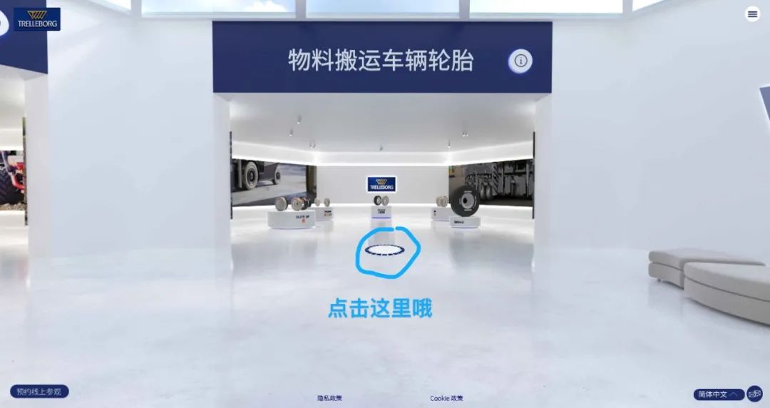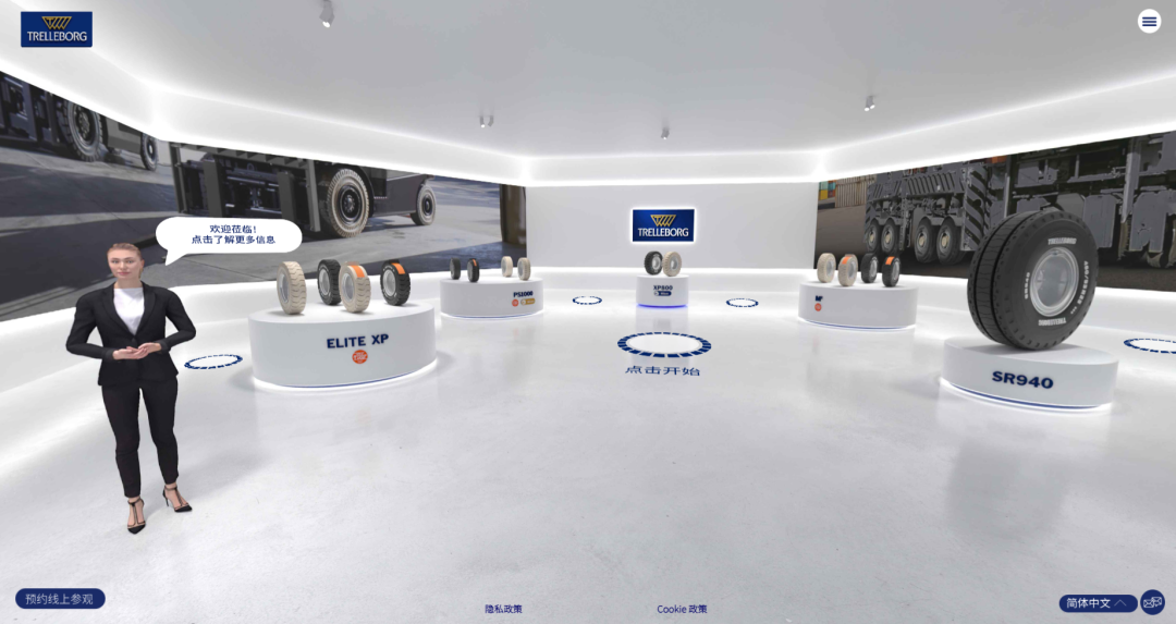 第四步,至此您已正式进入物料搬运车辆轮胎的展示区域。您可点击左侧虚拟人像获取音频信息,或点击屏幕中间的“点击开始”圆圈自行开始参观。