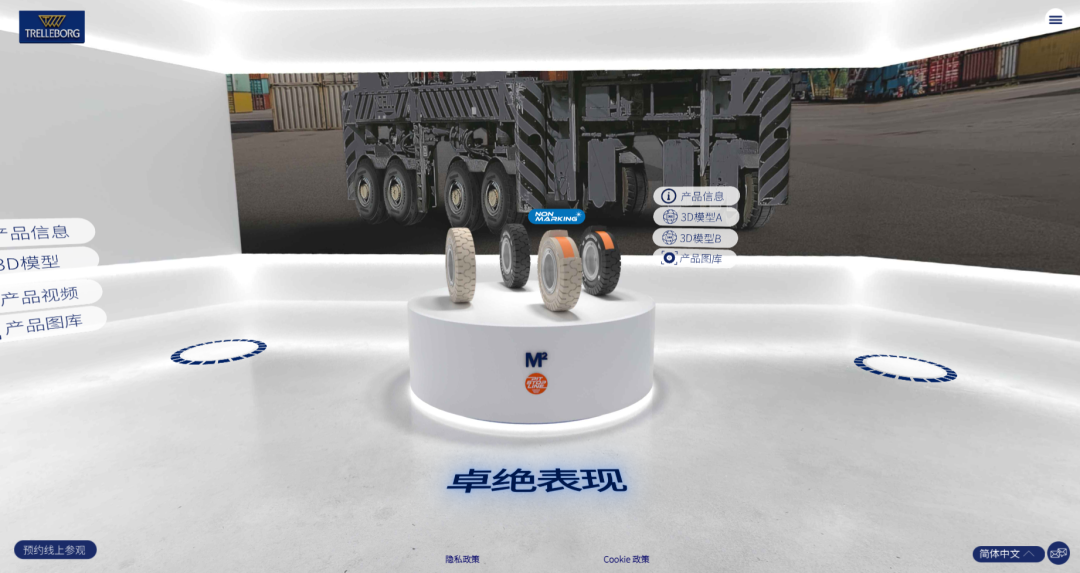 第五步,我们以正面前的这款M2可视化叉车轮胎为例,为您做进一步讲解。展品的右侧拥有包括“产品信息”,“3D模型”,“产品视频”(M2暂未上传视频),“产品图库”等选项按钮。点击对应的按钮,便可了解面前这款展品的所有详情。