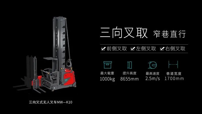 除全向堆垛式无人叉车外,劢微还拥有三向叉式无人叉车MW-K10、侧叉式无人叉车MW-SF10等应用于窄通道密集存储场景产品。