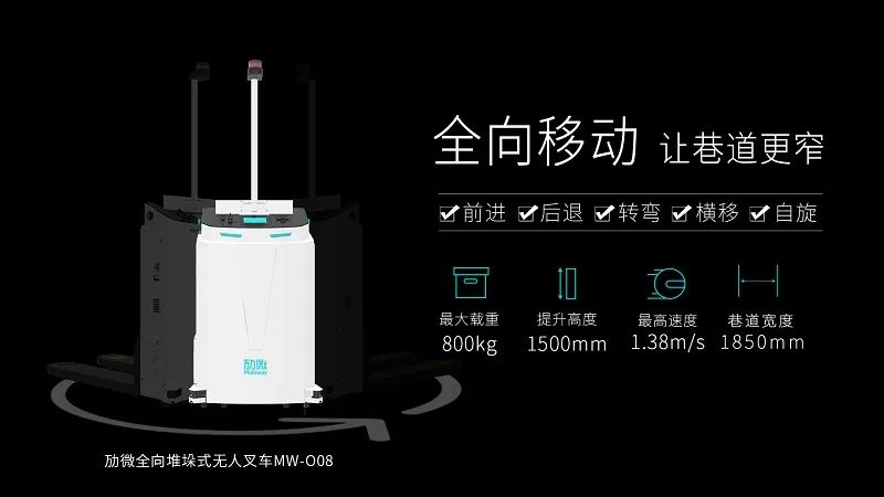 劢微机器人全向堆垛式无人叉车MW-O08采用激光导航定位,支持任意方向准确移动,前进、后退、转弯、横移,自旋,巷道仅需1.85m,载重800KG,整体更轻盈小巧,操作灵活,方便管理,可在狭小空间内进行有效的作业,极大提升仓储库容率,提升作业效率。