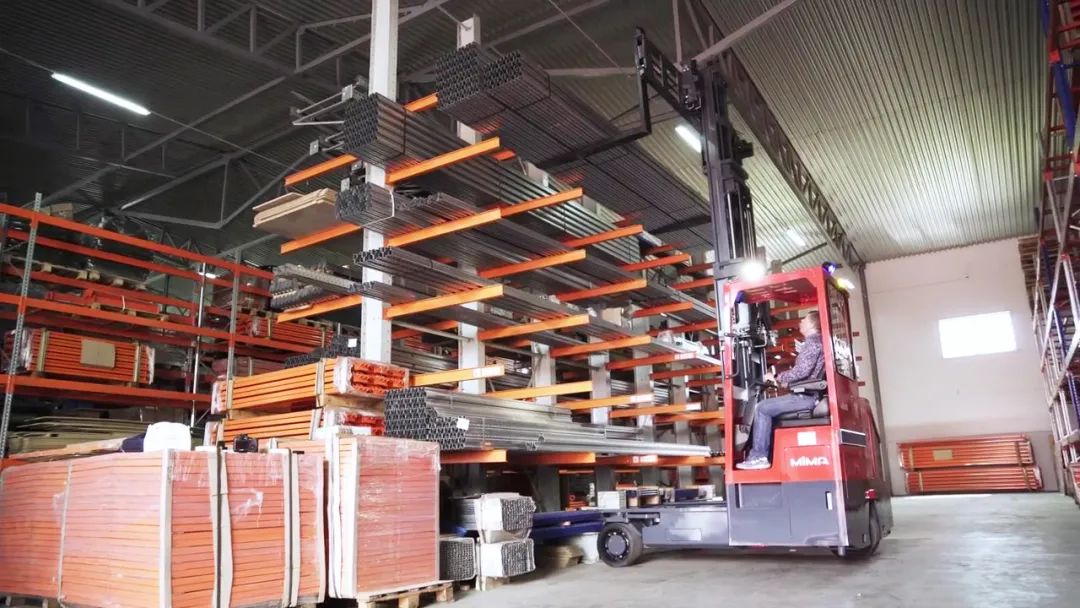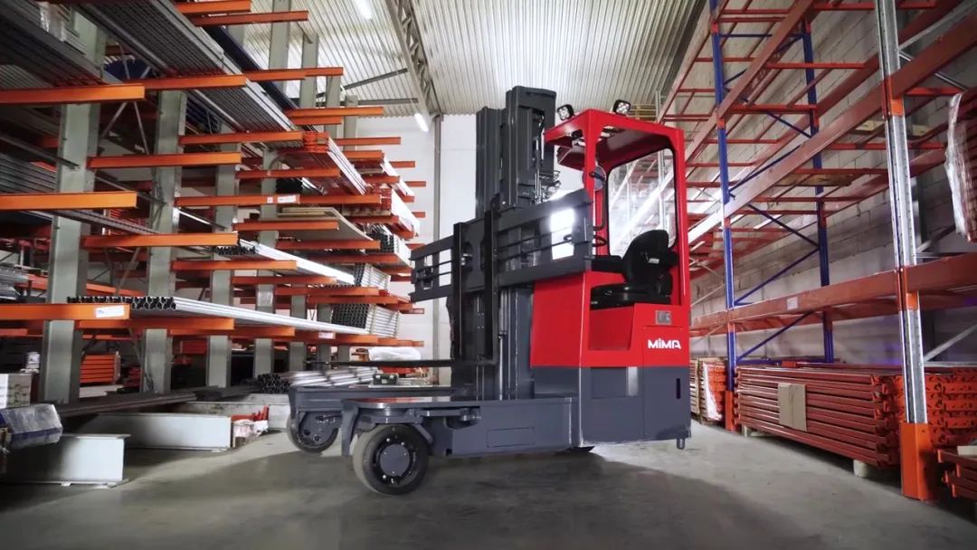 MiMA全向叉车适用于长物料搬运及长物料窄巷道堆垛作业。全向叉车通过侧行模式可缩减通道宽度,为提高库容量提供保证;同时斜行、直角转弯、360°原地回转等行驶模式,使得叉车在各巷道间穿梭行驶地更加便捷,也使得窄巷道堆垛更加具有优势。