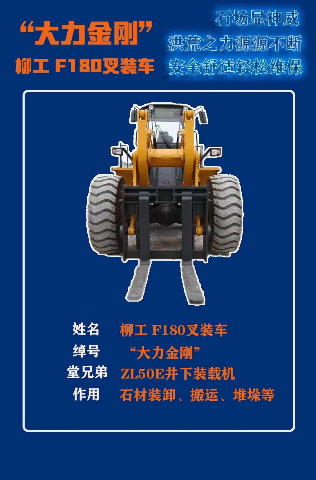 我是柳工F180叉装车,绰号“大力金刚”,跟“撼地金刚”ZL50E井下装载机是堂兄弟。和喜欢地下作业的它不同,我更经常出现在石材厂,负责石材装卸、搬运、堆垛等作业。我最多可以搬起18t的石材,是不是很厉害?