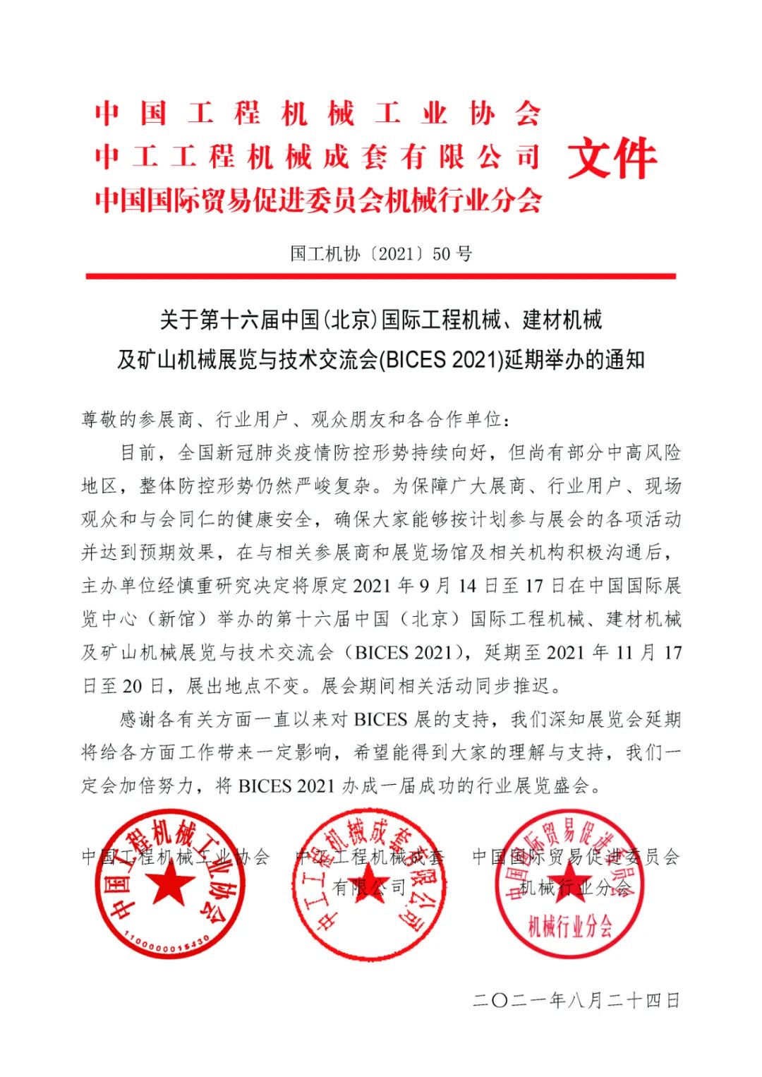 关于第十六届北京工程机械展BICES 2021延期举办的通知