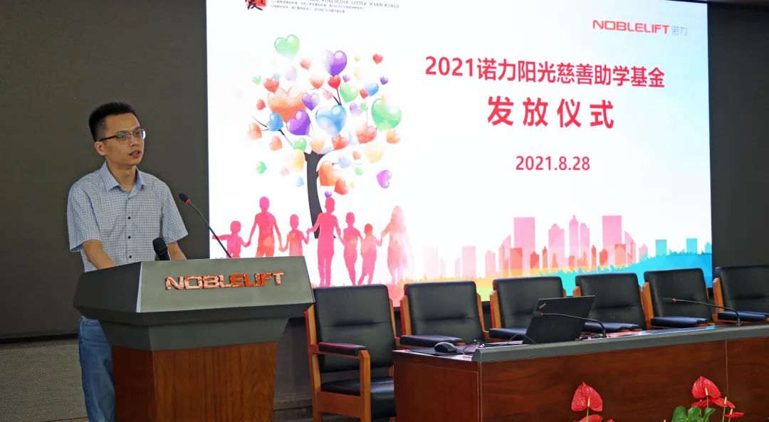 陈刚副书记在仪式上向各位同学及家长们介绍了诺力“大爱诺力 人人公益”的慈善文化理念,为大家讲述了诺力一直以来深耕慈善、助力公益的感人事例,鼓励大家积极面对家庭困难,树立知识改变命运的信心,用优异的成绩报答党和社会的关心、关爱。