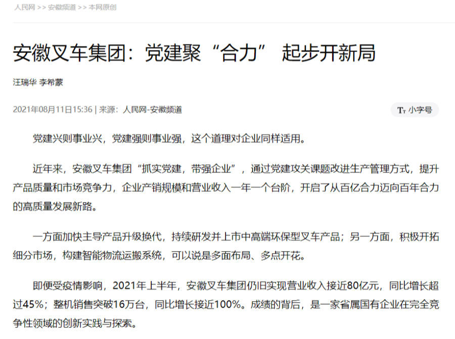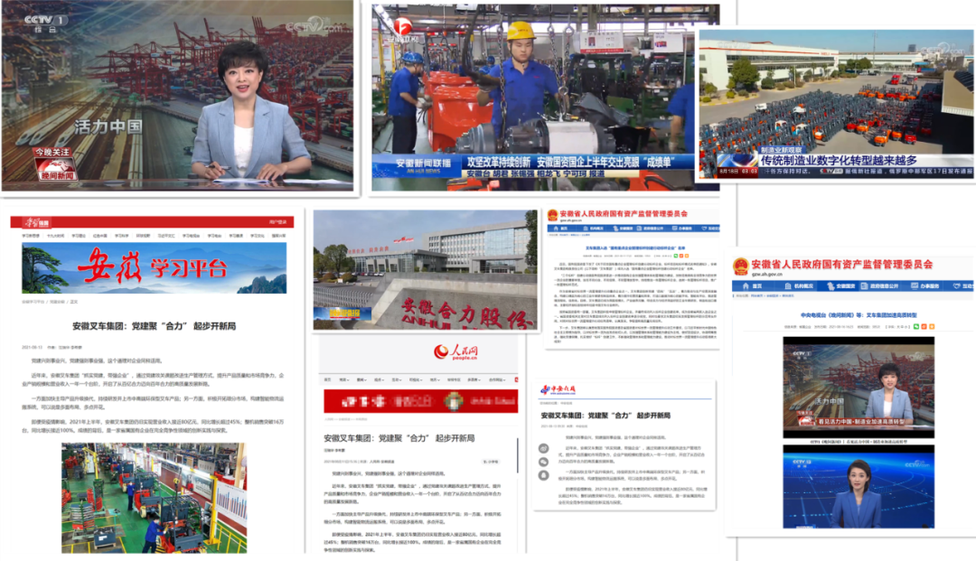 今年8月份以来,人民网、安徽电视台、合肥电视台等中央及省市主流媒体纷纷来到公司,与公司领导、高管及有关部门负责人就高质量党建引领企业高质量发展、制造业加速高质转型等主题,进行采访交流。近日,央视综合频道《晚间新闻》、央视新闻频道《新闻直播间》、人民网安徽频道、安徽电视台《安徽新闻联播》、合肥电视台《晚间播报》等媒体平台分别播放或刊登合力的相关视频、图文报道,公司市场和宣传部门也同步将有关报道转发推送到学习强国、中安在线、安徽国资及视频号自媒体等平台,其中,仅推送到学习强国的单篇报道阅读量就已近8万人次,引发广泛关注。