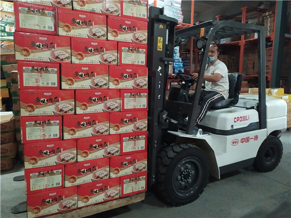 图为“东方红” “极锂版”锂电叉车在冷库装运“洛阳肉燕”。