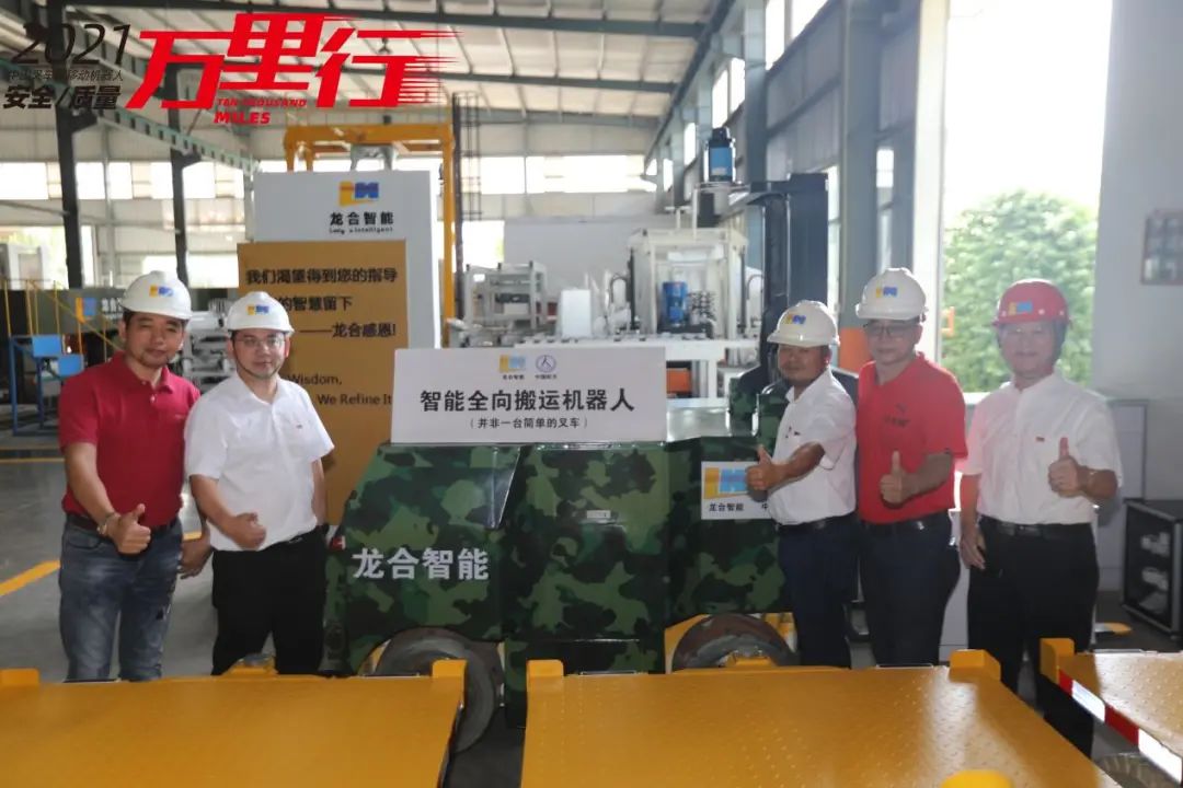 图:龙合智能杨林海、黄茂森等诸高层与中叉网总经理胡扬波在智能全向搬运机器人旁