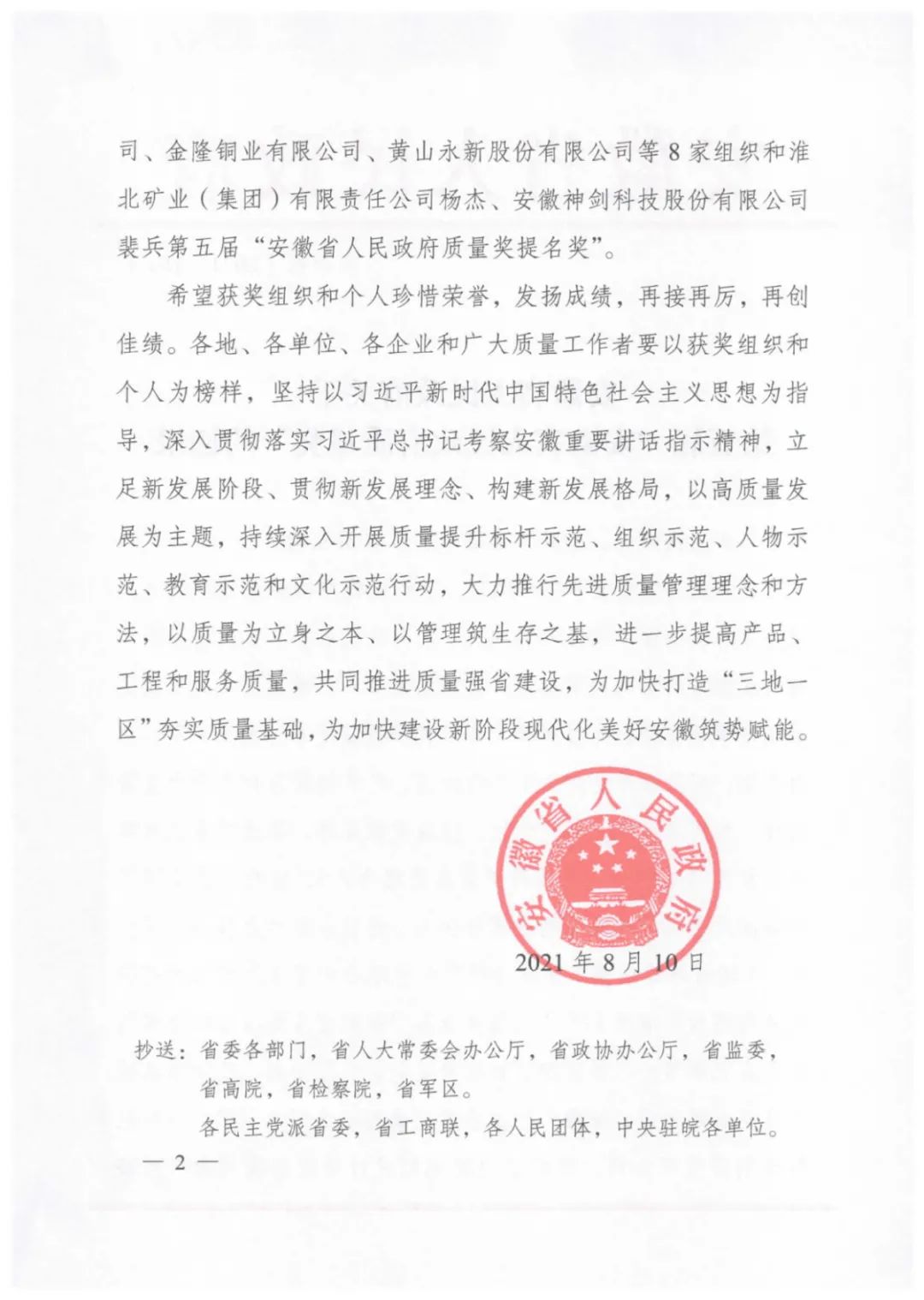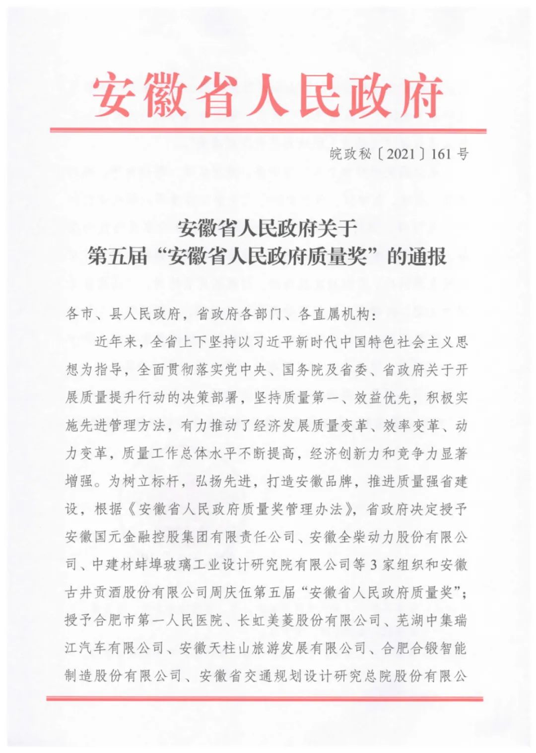 据悉,安徽省人民政府质量奖是安徽省人民政府设立的最高质量奖,每两年评选一次,授予安徽省具有独立法人资格、实施卓越绩效管理、有广泛的社会知名度和影响力、在行业内处于领先地位、并取得显著经济效益和社会效益的企业。