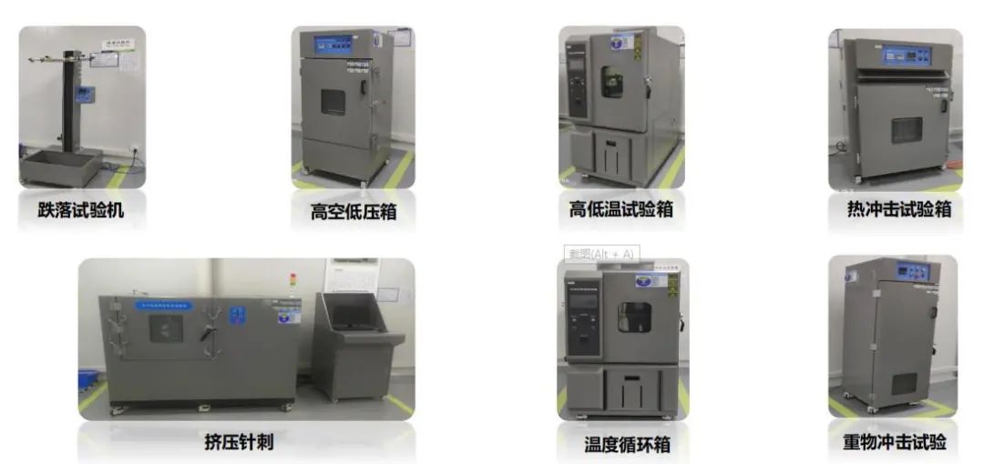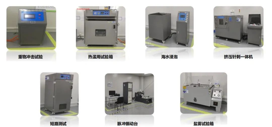 安全与环境检测中心拥有电芯、模组以及电池包的安全试验和环境试验设备,包括挤压针刺、短路、热滥用、重物冲击、冲击振动、高低温、热冲击、海水浸泡与盐雾等设备。