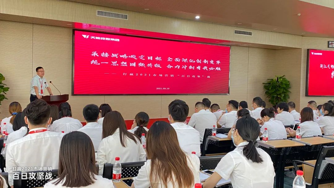 9月19日,天能铅酸电池事业部召开打赢2021市场营销“百日攻坚战”动员大会。大会以“承接战略咬定目标,全面深化创新变革,统一思想同频共振,合力冲刺有我必胜”为主题,上承力争“八五天能”胜利开局之势,下启打赢百日攻坚战役之志,是铅酸电池事业部在关键时期召开的一场以强化创新意识,全面激发活力,推动变革落地成效,确保战略目标实现为目的重要会议。