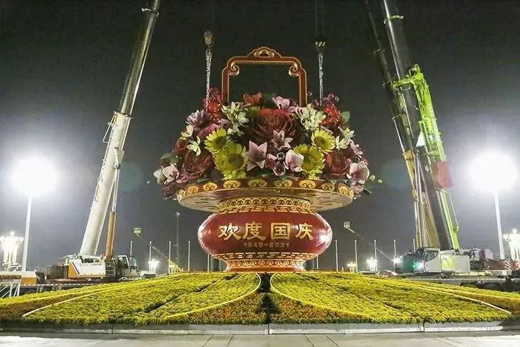 9月23日早上,北京市民惊喜地发现,天安门广场前一个顶高18米的大花篮竟然在一夜之间完成吊装。花篮里插有约10朵巨型仿真花:向日葵、山丹丹、映山红、红梅,象征红心向党、奋勇拼搏;牡丹、康乃馨祝福祖国繁荣昌盛。据了解,此次吊装共使用了两台300吨中联重科起重机夜间作业,经过5个小时的联合协作、高效施工,“祝福祖国”花篮主体结构于23日凌晨吊装完成。