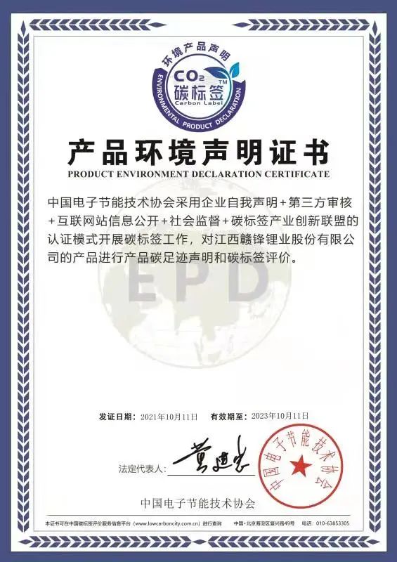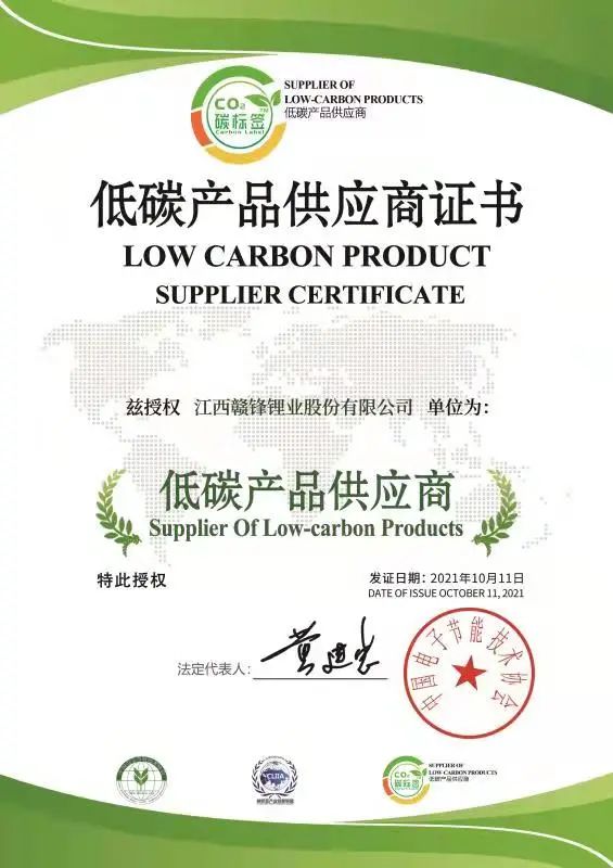 2021年10月11日,赣锋锂业旗下产品“单水氢氧化锂”通过碳标签认证,成为国内首个获得“碳标签”的锂企业。