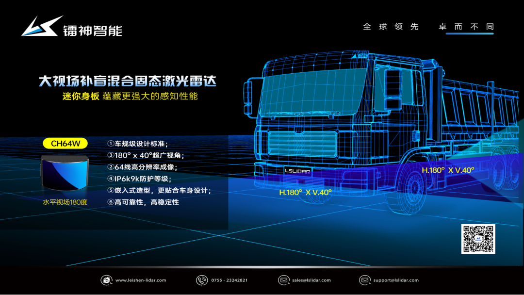 镭神智能CH64W拥有180°x 40°的超广水平视场角,保障水平方向180°无盲区、垂直方向40°高效识别车辆周边车辆、行人、障碍物等,为汽车、机器人、AGV的行驶盲区带来精准的环境感知。
