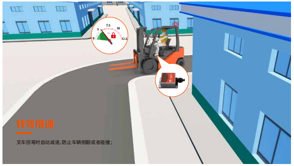 转弯限速:叉车拐弯时自动减速,防止车辆侧翻或碰撞。