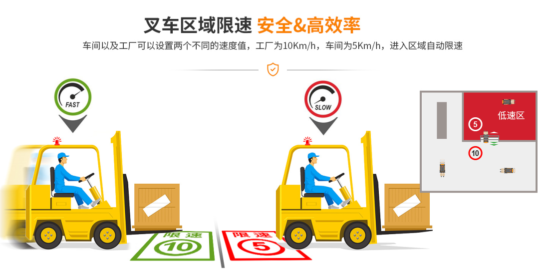 例如,仓库的管理者可能要求叉车驾驶员在仓库的走廊和过道中保持较低的速度,在拐角处和下坡道上降低速度,并在驾驶员可见度降低的区域中保持较低的速度。所以区域限速的需求我们也考虑到了!支持定制!